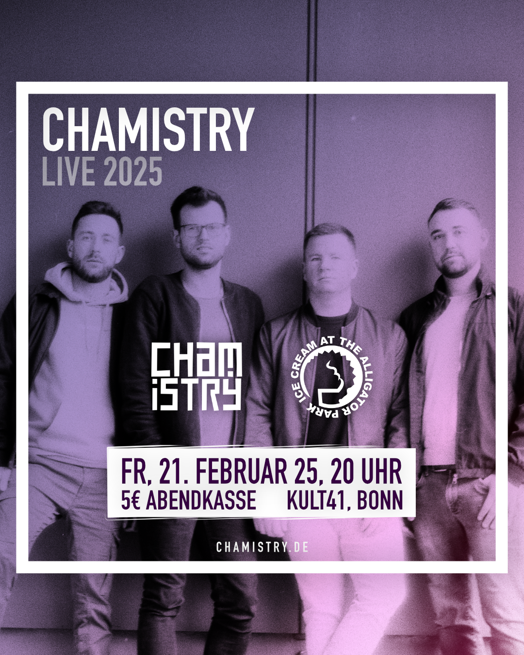 Im Februar sind wir mal wieder zu Gast im Kult41. Ice Cream At The Alligator Park bietet die perfekte Ergänzung für einen Abend voller Alternative Rock Sounds! Die vier Jungs plus Frontsängerin versprechen als Kölner Band viel Live-Energie und ein rundes Doppel-Konzert mit chamistry. Wir freuen uns sehr!